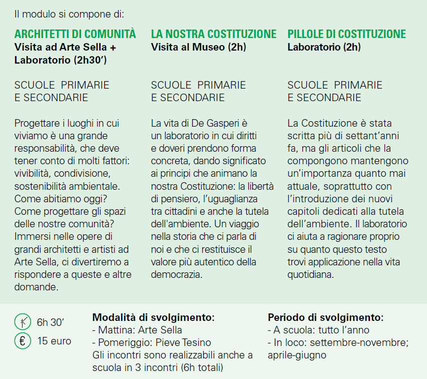 dal lun al ven, dalle 8.00 alle 12.00; Museo Casa De Gasperi: didattica.fdg@degasperitn.it; tel. 331 4745389